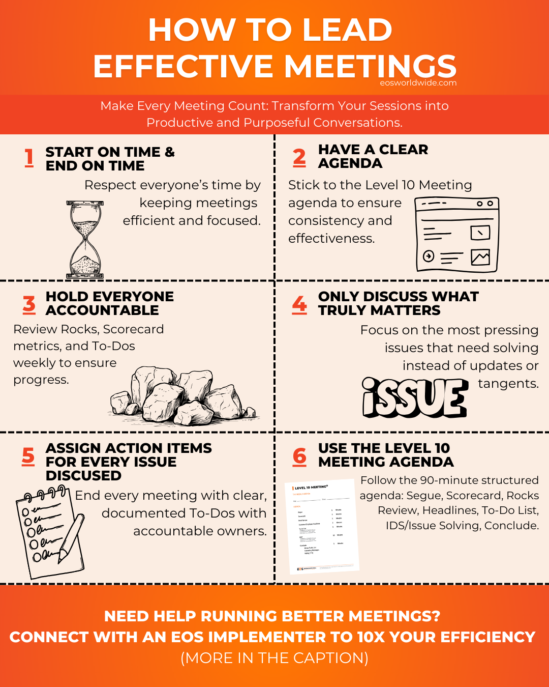 But when we implemented EOS, we started running what's called a Level 10 Meeting, or L10 for short. Same agenda, same structure, every single week. Simple...game-changing!